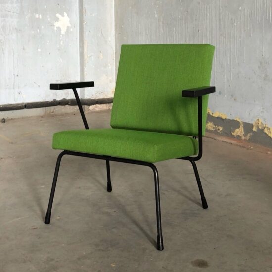 Deze vroege editie fauteuil heeft het originele vernikkeld frame van de eerste generatie. De Oyster was in de Artifort collectie tot 1979. Op verzoek bracht Artifort het ontwerp opnieuw in productie vanaf 1999.